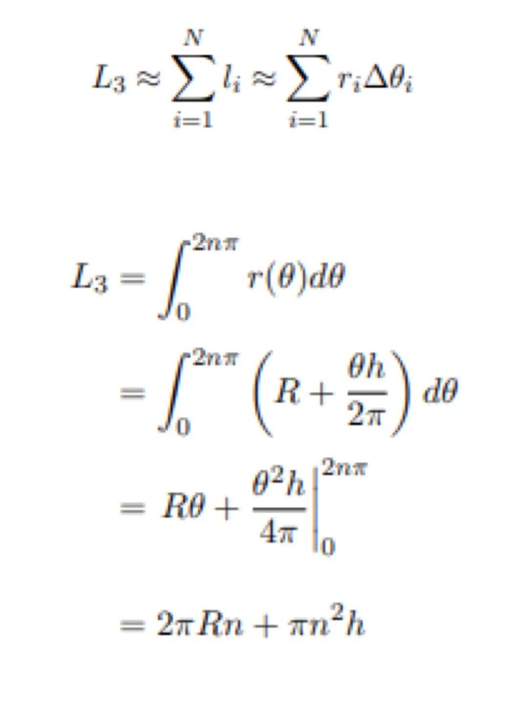 不过,纸卷的情况要比这个更复杂,因为纸不断缠绕的时候,圆环的半径也在不断增加。与其把它看成是一层一层的圆环,还不如直接看成一个螺旋,通过旋转的角度来计算螺旋的总长度。然后再把纸巾转过的所有角度都加起来就好了。