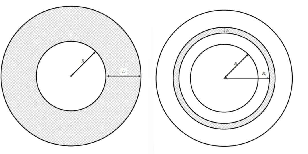 从最基础的开始算起,我们可以将卫生纸看作一个半径为R的纸筒,上面一共缠了n层纸,就可以看成是套了n层圆环。纸的总厚度为D。而一张纸的厚度为h。