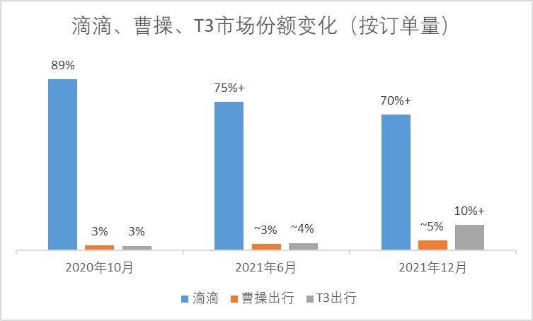滴滴失去的份额落到谁的手里了呢?主要是T3出行。按照上述估算,2021年12月,T3出行的月订单量大概率已超7000万单,达到滴滴体量15%左右的水平。在2020年10年,这一数字还仅是3%。