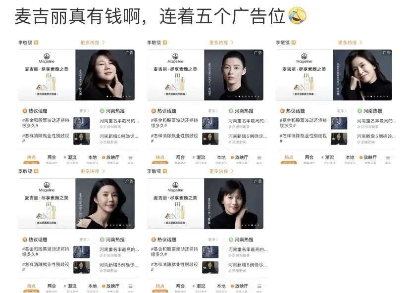 在它发起的发现中国女性素颜之美话题下,参与阵容可以说是豪华,代言人就有张柏芝、文咏珊、杨天真、papi酱,还承包了微博发现页所有的广告位,知名媒体账号为它植入软广页也不在话下。