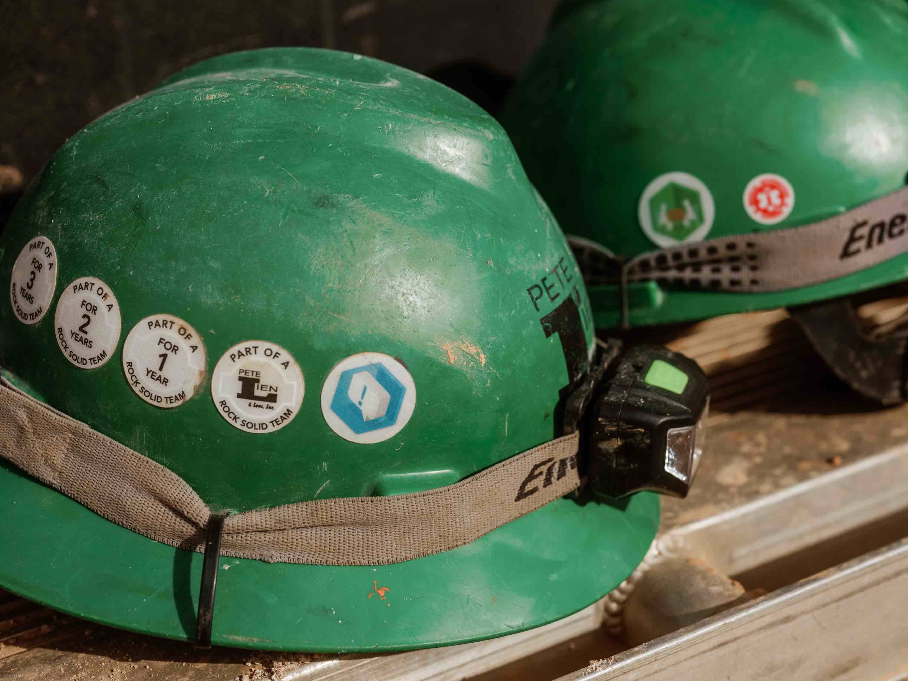 矿工的帽子上会贴上相应的贴纸,向同事展现他们“爱的语言”|摄影 Matthew DeFeo