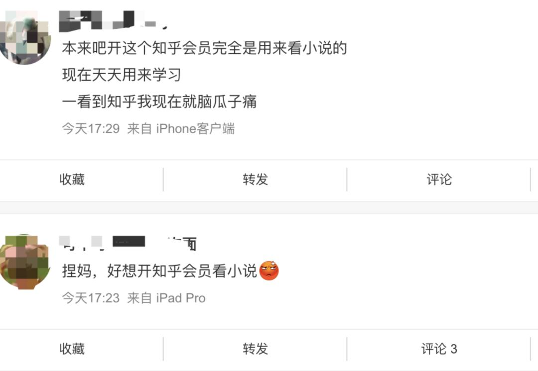 一位2019年开始使用知乎的网友向市界提到,她早先使用知乎是为了查询留学方案,但直到前阵子在知乎看小说,发现读到后边的关键部分,提示以下为会员内容,才第一次给知乎充钱买会员。