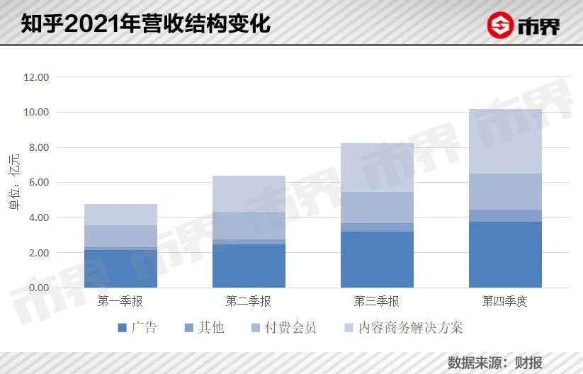 整体来看,早先,知乎以广告作为业绩的驱动引擎,如今已明显改变。知乎创始人周源透露,2022年整年预计收入增幅在60%到65%,其中商业内容解决方案业务有望成为最大的收入来源。