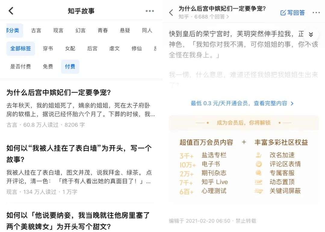 到2020年10月,知乎在会员栏目中上线“故事”专栏,进一步鼓励创作者发表小说、故事。
