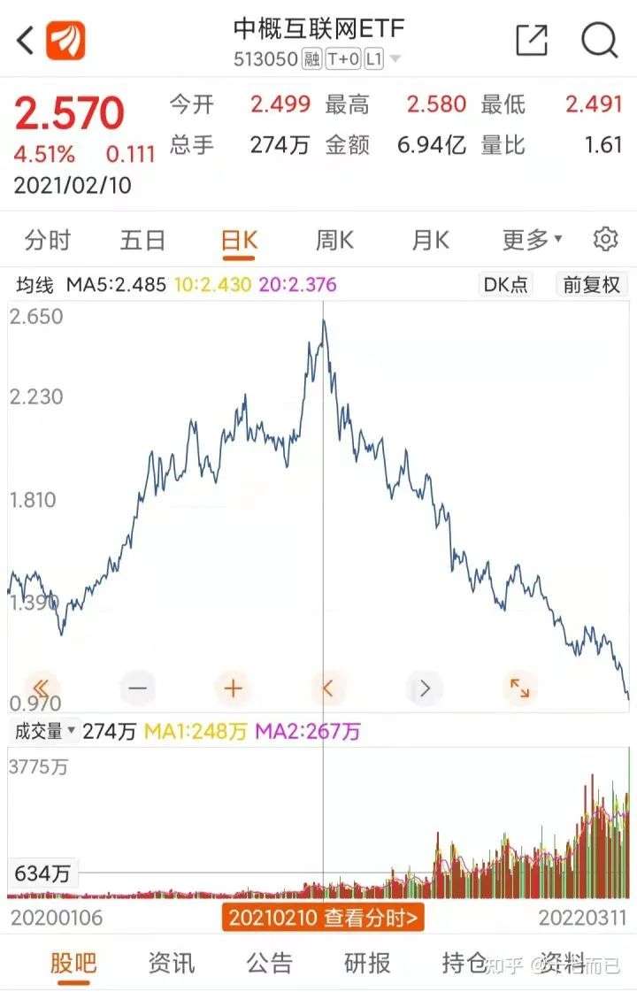 从数据来看,2021年2月至今,中概互联ETF全年呈下跌趋势,从2021年2月10日2.57元的高点跌至如今的1.02元(数据截至2022年3月11日),跌幅达60%。
