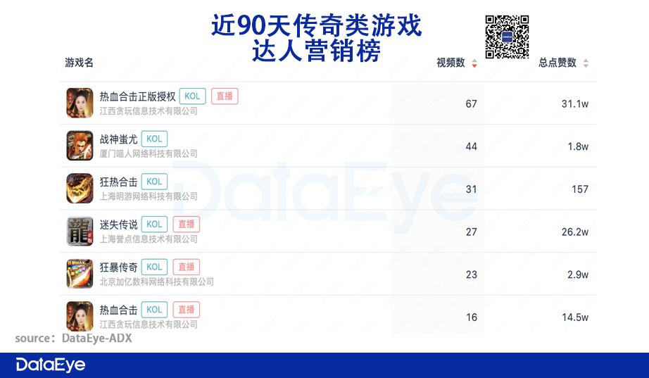 2、相对蓝海。在达人营销榜上, 仅有18款产品共计251个视频,相较于休闲榜数以十万计的视频量,传奇榜可以说是毫无竞争压力。