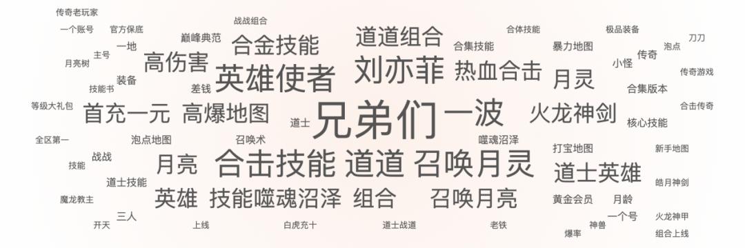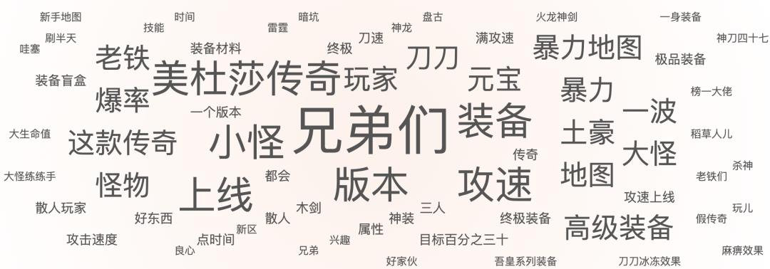 首先,在高频词汇的抉择上,《美杜莎传奇》更倾向爆率、元宝、攻速、刀刀等词汇。
