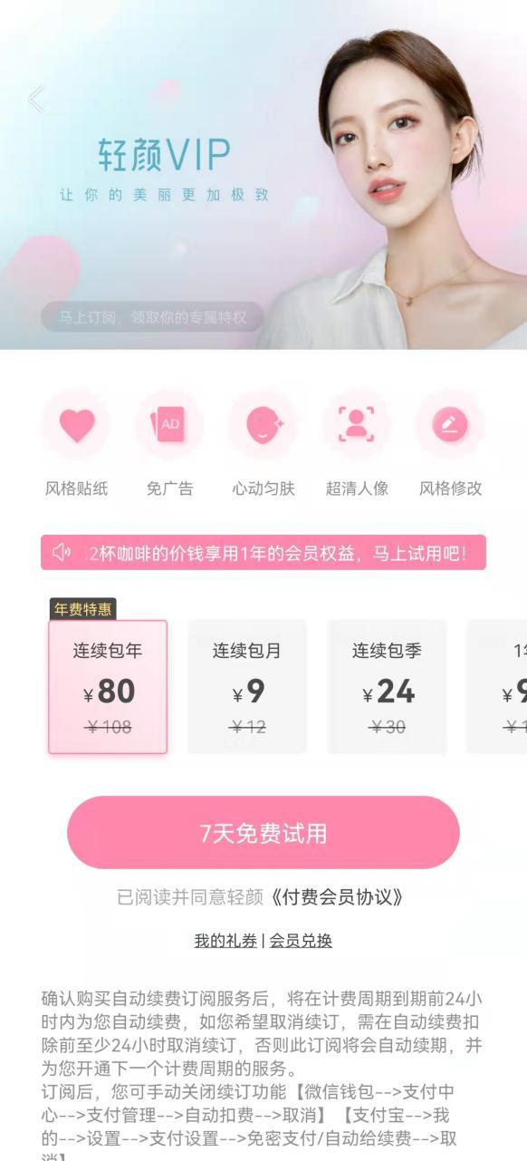 为了提高用户的付费意愿,不少应用都采用了X天免费试用、第一个月价格极低的“特惠连续包月”等措施,让更多用户先体验付费功能,以提高潜在长期付费群体的用户数量。