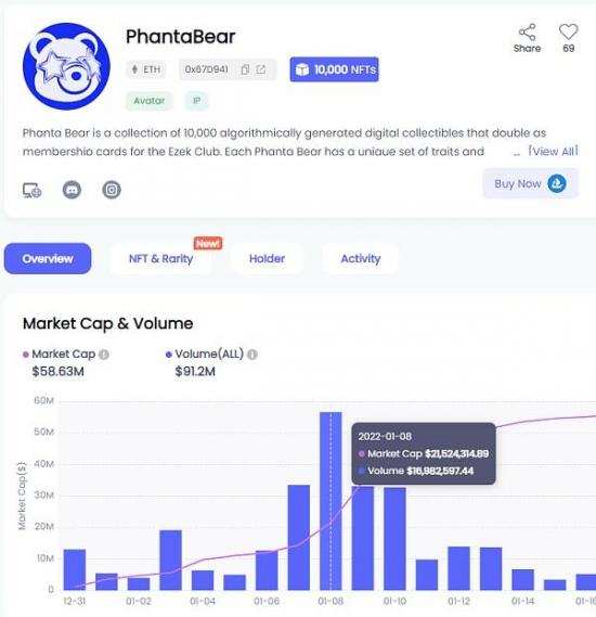 又比如,2022年1月18日,周杰伦与好友合伙创办的潮牌宣布发售NFT项目——幻想熊,限量1万个,售价为0.26个以太坊。然而发售仅仅一周,就达到单个7.4ETH的高价,相当于114975人民币。