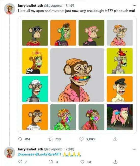 2月1日,一位NFT收藏大户larrylawliet.eth在社交媒体表示,其持有的多只Bored Ape Yacht Club、Mutant Ape Yacht Club以及Doodles NFT等系列价值不菲的NFT藏品被黑客盗取,这批失窃的NFT总价值约为人民币1079万元。