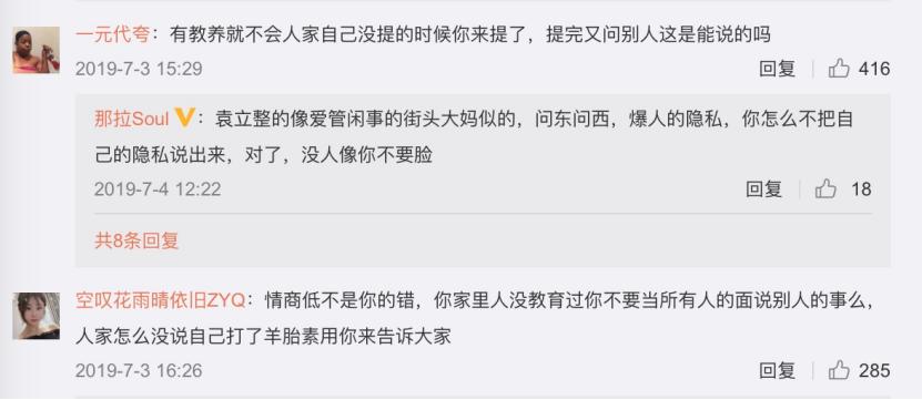 2019年,袁立再次在微博上回应羊胎素事件,其评论区风向仍然是嘲讽袁立,斯琴高娃仍旧是作为“被侮辱与被损害的”令人同情的存在。