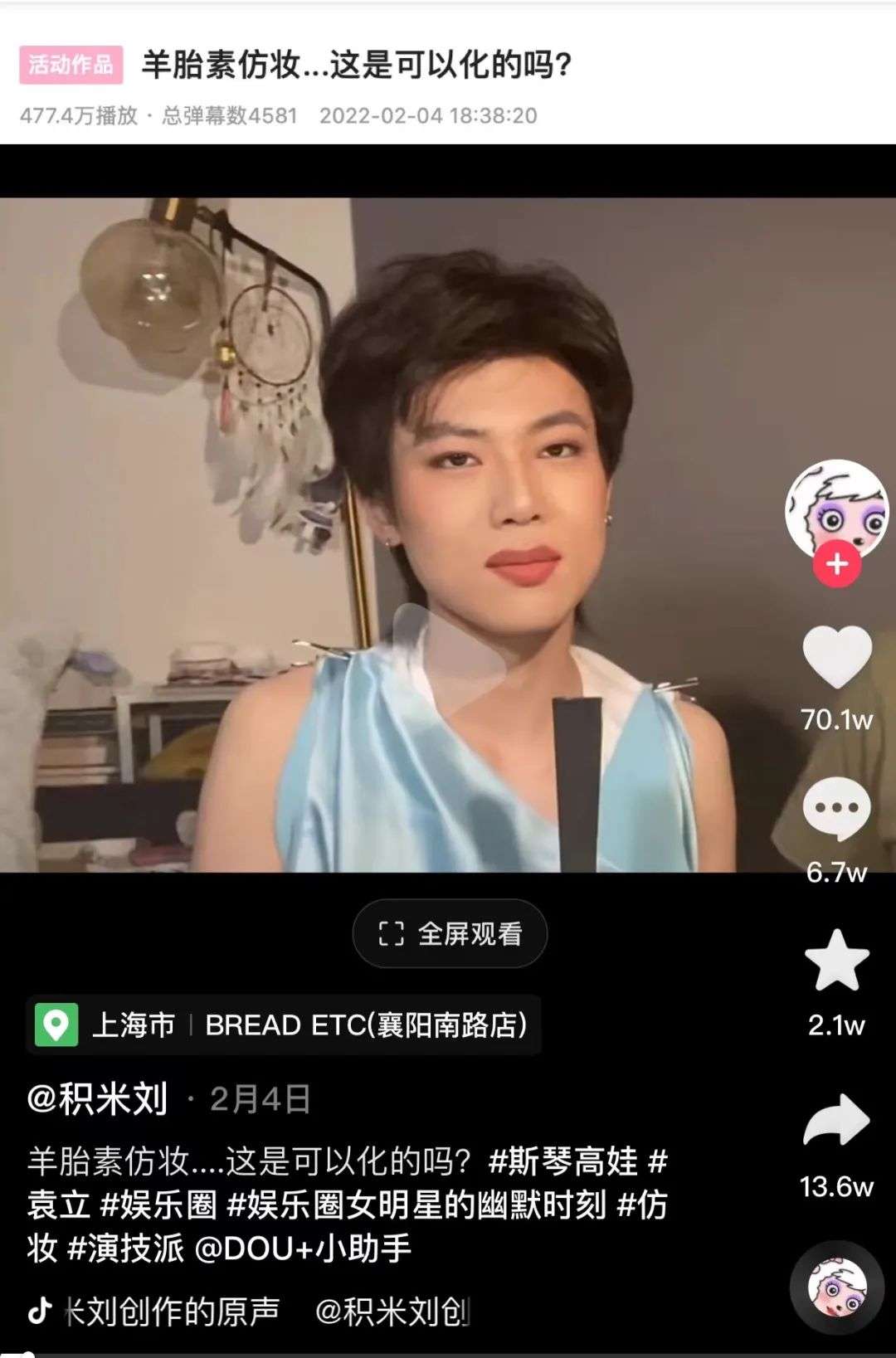 而2022年2月4日,up主积米刘在B站、抖音、微博多平台同步发布视频《羊胎素仿妆……这是可以化的吗》。积米刘是一位男性博主,视频风格以较为夸张的美妆、仿妆为主。