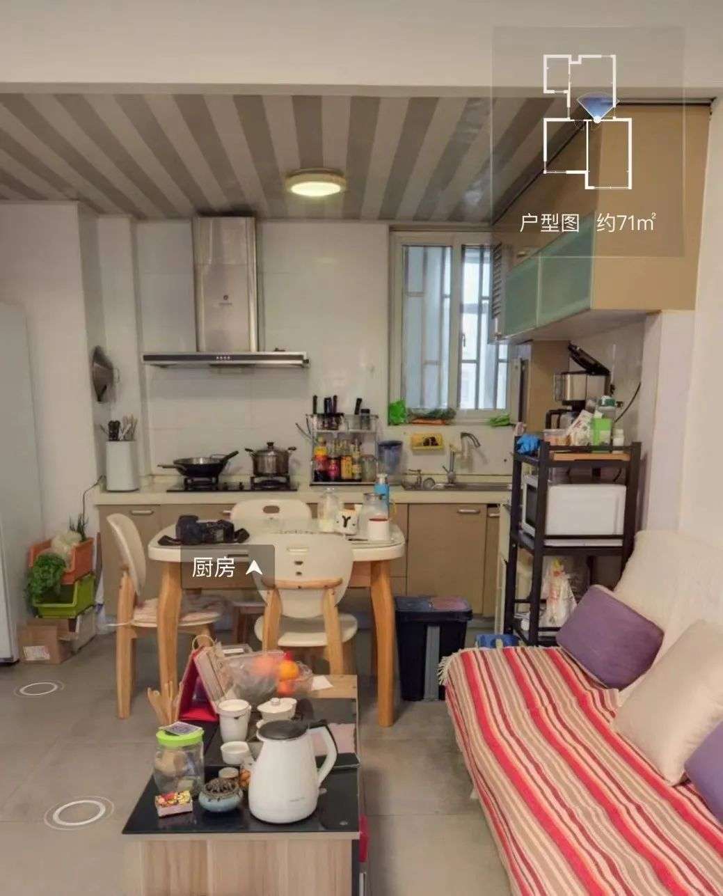 因为它的北面是封起来的,小小的一扇窗无法满足房屋内的通风采光。所以,你会看到白天餐厅上方还亮着灯。