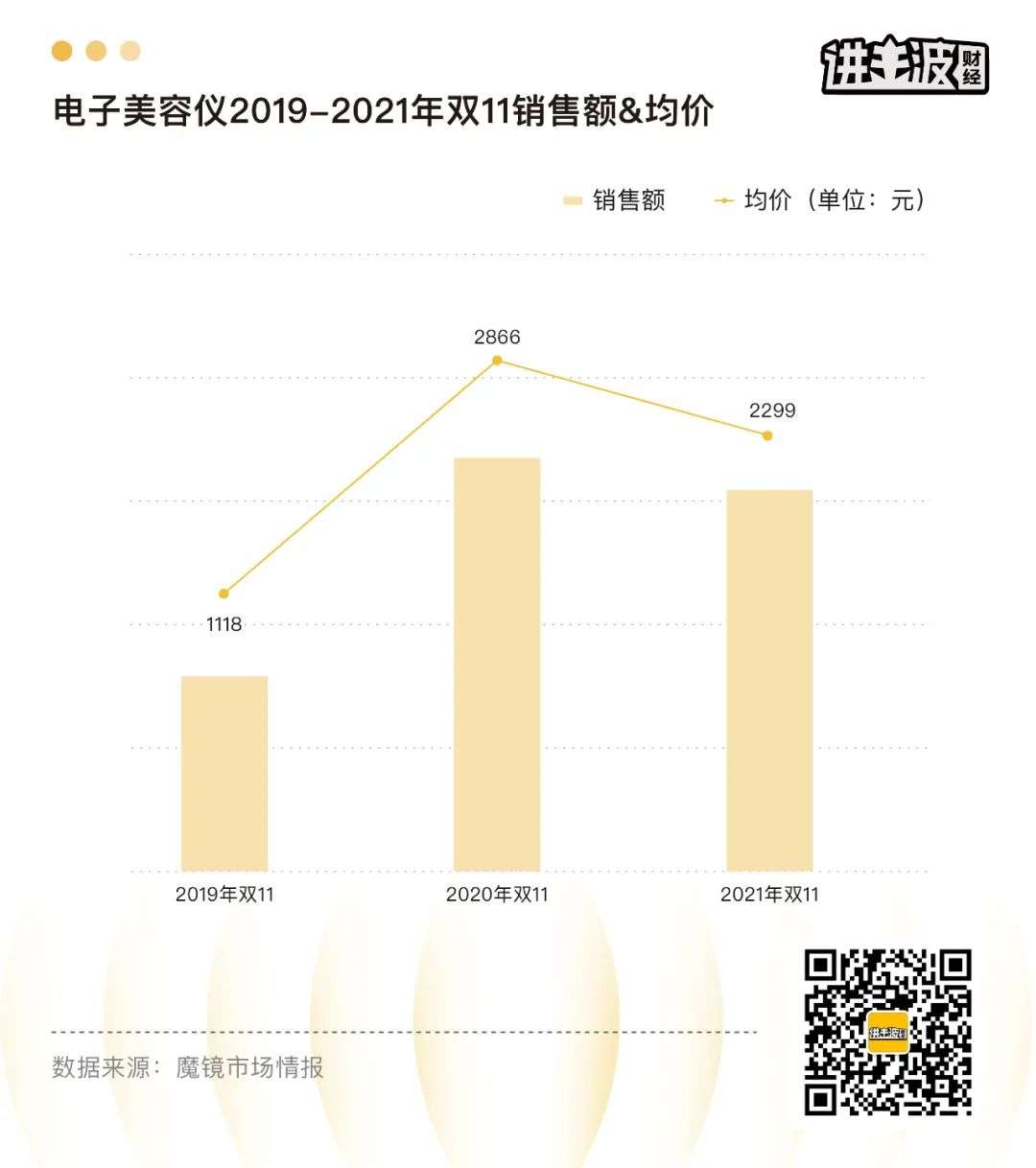 值得注意的是,根据魔镜市场双十一情报数据显示,电子美容仪的平均客单价从2019年双11的1118元上升至2021年的2299元,两年翻了一番。
