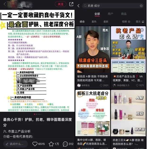 在这个基础上,美容护肤消费市场的“抗老概念”成为了热门(带货)话题。例如,“抗老有效成分”、“早c晚a”、“功能性护肤”、“成分党”等等。这一语境下,功能性品类更受消费者欢迎,精华比面膜卖得更好。