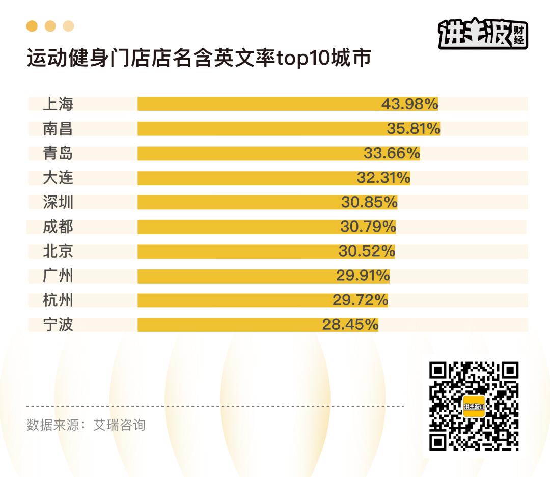 上海作为国际化大都市,含英文的店名占比最高,达43.98%以上,北京、成都、广州等主要城市这一比例约在三成左右,与上海差距较大。