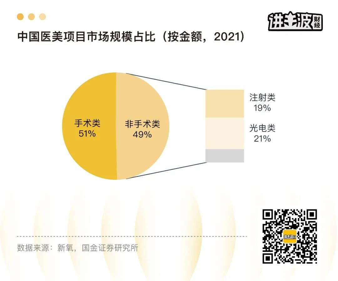 大家爱美,但不爱动刀,非手术类的受欢迎程度更高。其中,玻尿酸、肉毒素、再生类和光电射频四条细分赛道贡献了行业主要营收。而「玻尿酸和肉毒素」作为两大入门级「注射类」项目,市场规模远大于其他品类。