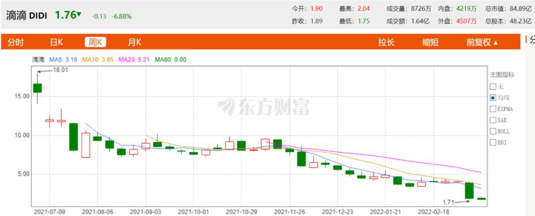 上市后,除首个交易日曾摸高至18.01美元/股,滴滴此后便一路跌跌不休,截至2022年3月15日收盘,滴滴的股价已从14美元/ADS跌至可怜的1.76美元/股,4000多亿市值灰飞烟灭。