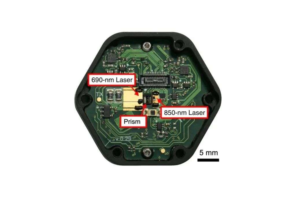 激光源周围有六个六角形排列的探测器,每个探测器与光源的距离为 10 mm。探测器会拾取反射光,记录光子到达时间,每秒大约可探测超过十亿个光子。
