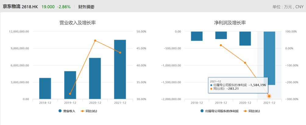 招股书及近期财报数据显示,2018年至2021年,京东物流营收均保持40%以上的增长速度,但亏损同样与日剧增,分别亏损22.34亿元、41.34亿元、158.42亿元,2021年净利润同比下降283%。
