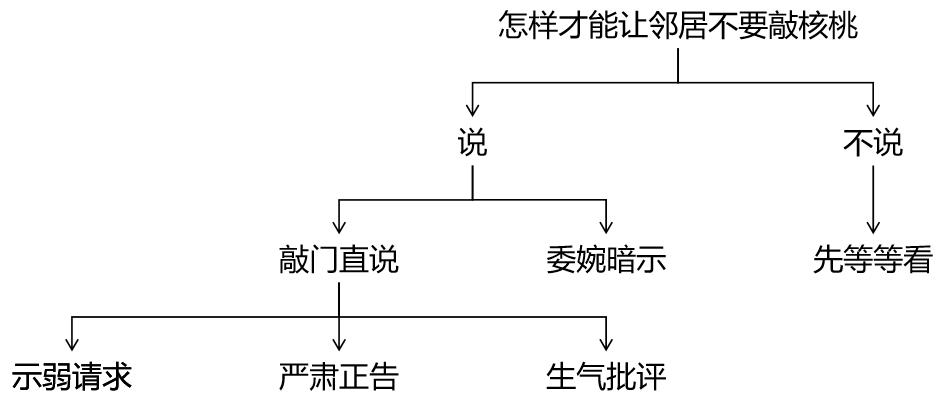 你看,张三的问题是:怎样才能让楼上的邻居不要敲核桃,所以他的招数都是围绕“让邻居不要怎样”。