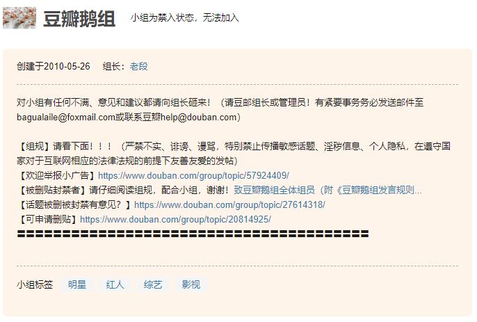另外,豆瓣“代表月亮消灭居心不良的乐手”、“父母皆祸害”、“脏脏鹅组(囡组)”等都是话题敏感,争议较大的小组。目前,他们在豆瓣站内处于“被雪藏”或者“私密”状态,组外成员无法搜索到且看不到小组内容,而组内发帖主要由组长或管理员自发管理。