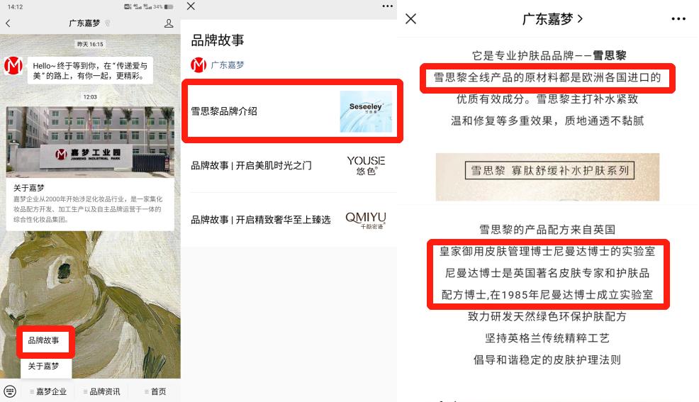 而第三处涉及虚假宣传的内容为:2019年4月13日,广东嘉梦公众号在“雪思黎品牌介绍”板块中发布的相关产品信息。