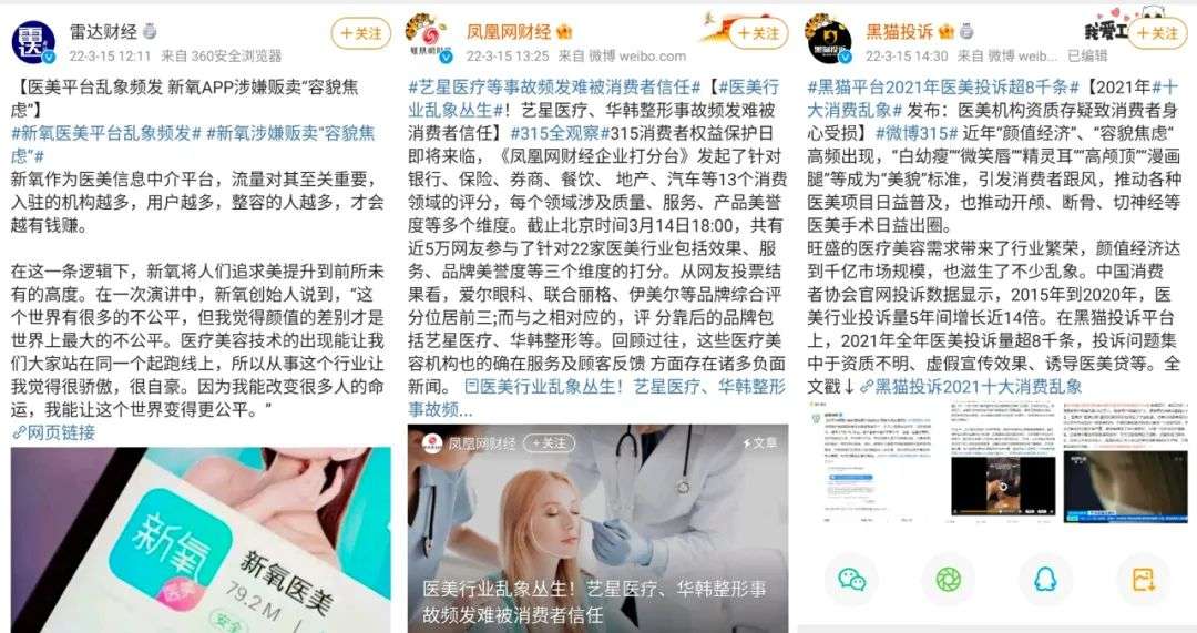 实际上,不止晚上的315晚会,今天的微博话题中,与医美行业相关的讨论也非常多。雷达财经、凤凰网财经、黑猫投诉等许多蓝V号都分别发布了与医美行业乱象相关的内容,涉及医美信息平台、医美机构等多个主体,植发、双眼皮等多个医美项目,医美培训、医美贷款、医美产业利益链条等多个方面。