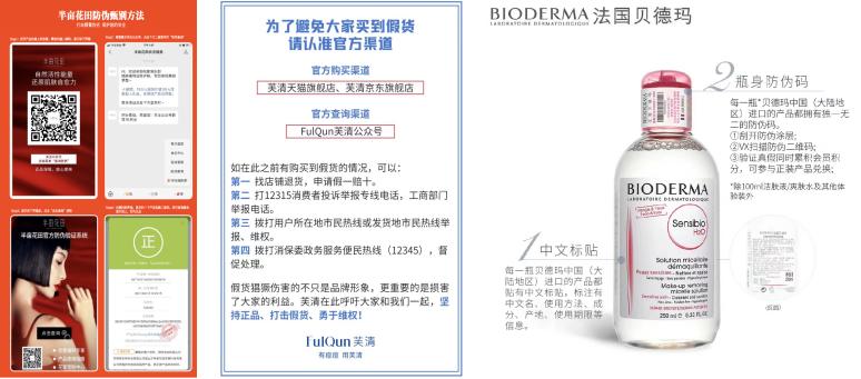 半亩花田、神秘博士、芙清、贝德玛、蜜丝婷、阿道夫等品牌都对假货/山寨品进行过各种形式的打击,也为消费者提供了正品甄别方法和官方渠道的提示。
