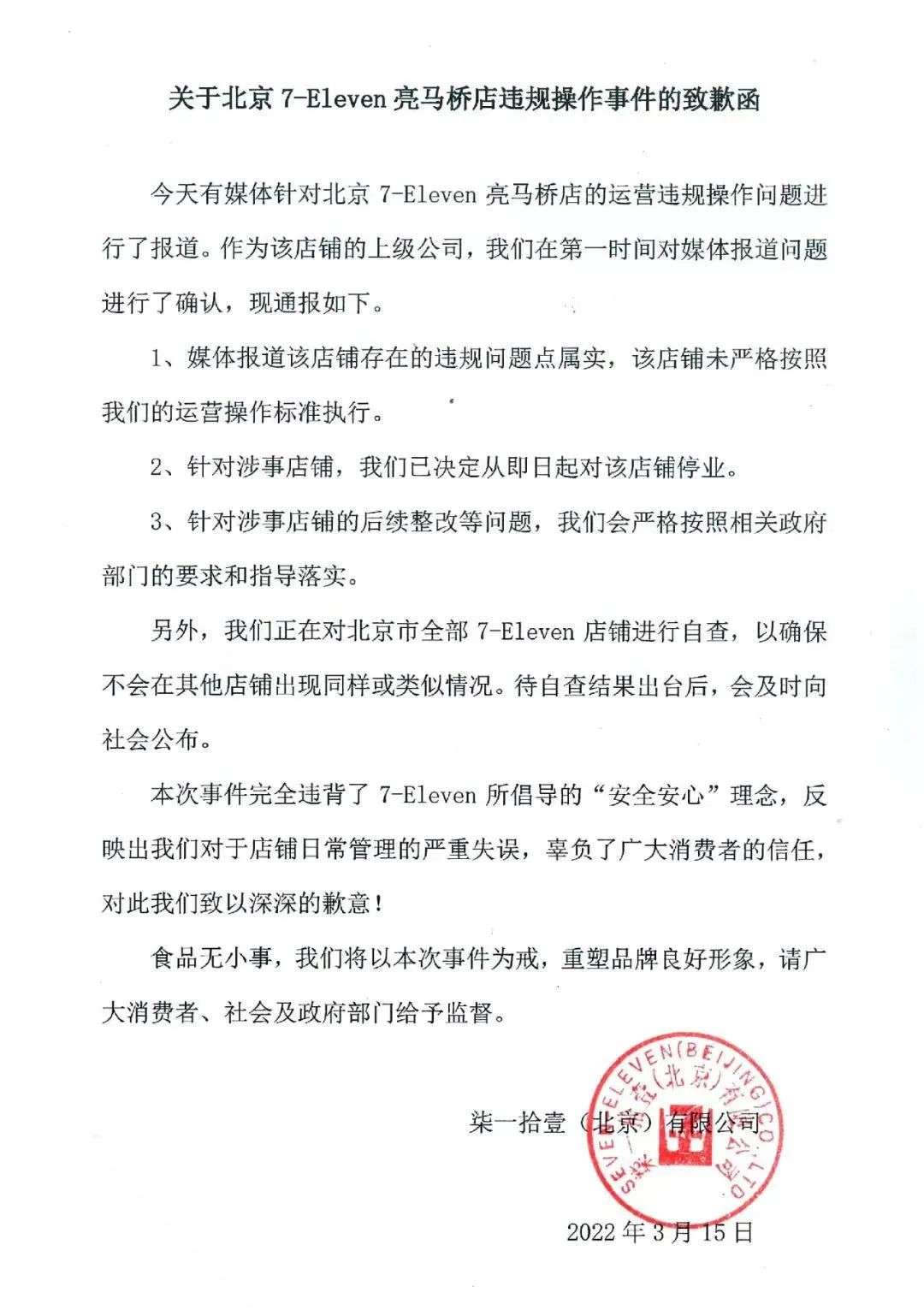 当日16:00左右,7-11北京公司发布了致歉函,表示该店“违规问题属实,该店铺未严格按照我们的运用操作标准执行”,“即日起该店铺停业”,7-11北京同时对全市店铺自查,自查结果出台后,会及时想社会公布。