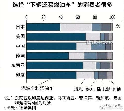 选择燃油车的受访者在各国均较多。美国和东南亚约为7成,中国和印度约为6成。即使是在积极购买纯电动汽车的欧洲,德国也达到约5成。今后选择纯电动汽车的受访者在美国仅为5%,但在中国达到17%,德国为15%,高于日本。