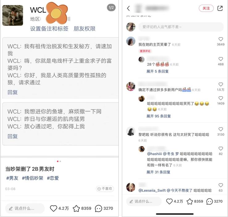 比如这一篇分享情侣拌嘴的笔记,传达了一种“分享搞笑日常”的情绪,能够激发起有同样经历用户的关注,调动起讨论的兴趣。