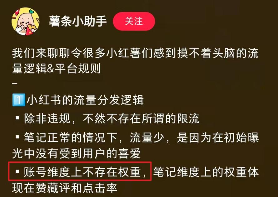 在 @薯条小助手 发布的笔记中,强调了小红书在账号维度上不存在权重。
