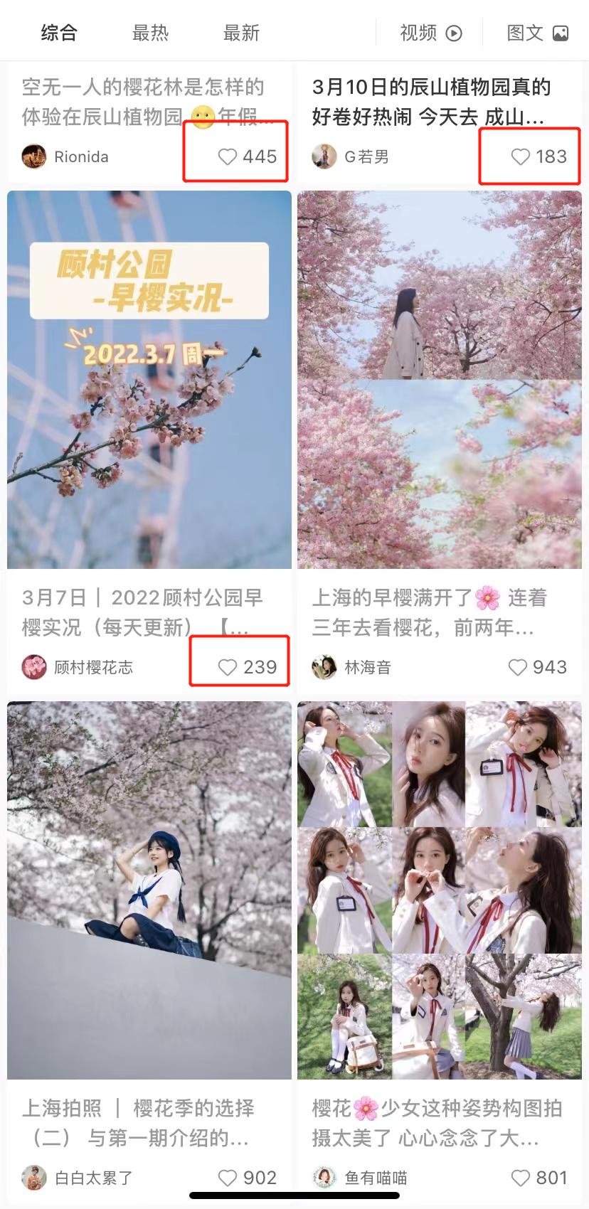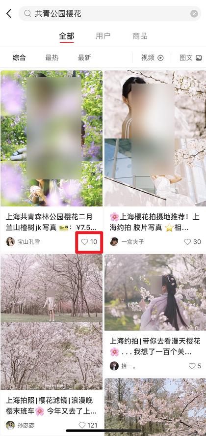 比如说,运营社搜索“上海樱花”后发现,有几篇点赞数量为 200-400 的笔记,它们的排名在点赞量为 1000 左右的笔记之上,内容都是与“上海樱花”相关。