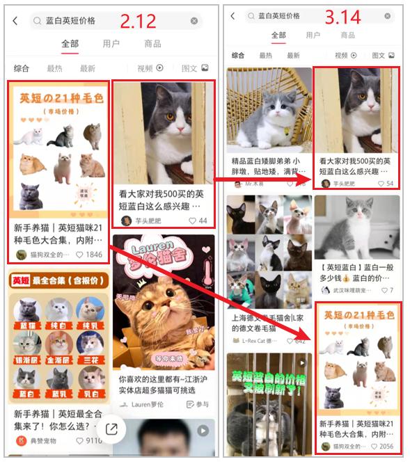 比如,运营社相隔一个月去搜索一个较为“细分”的关键词「蓝白英短价格」,上一个月搜索页前两名的笔记依旧留存在靠前的位置。