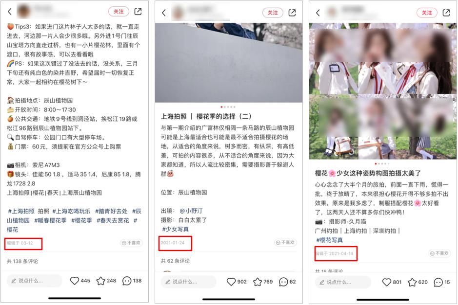 下图中的第一篇笔记大约是于 3 月 12 日发布,短短两三天时间内就获得了 400+ 点赞,具备“爆文潜质”的;而后面两篇点赞约为 1000 的笔记,则是早早发布于 2021 年上半年,与现在相隔 1 年左右。