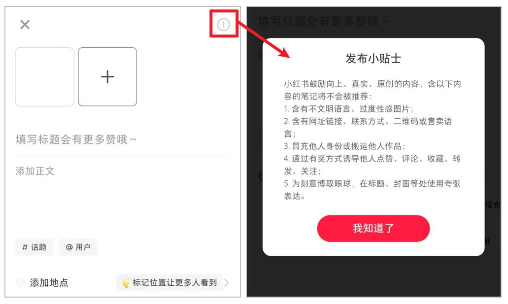 注重用户价值,从反面来说,也需要规避不符合社区价值观的内容产出,比如炫富、擦边球、恶意引战等等。在小红书的笔记发布界面,也有相应提醒。