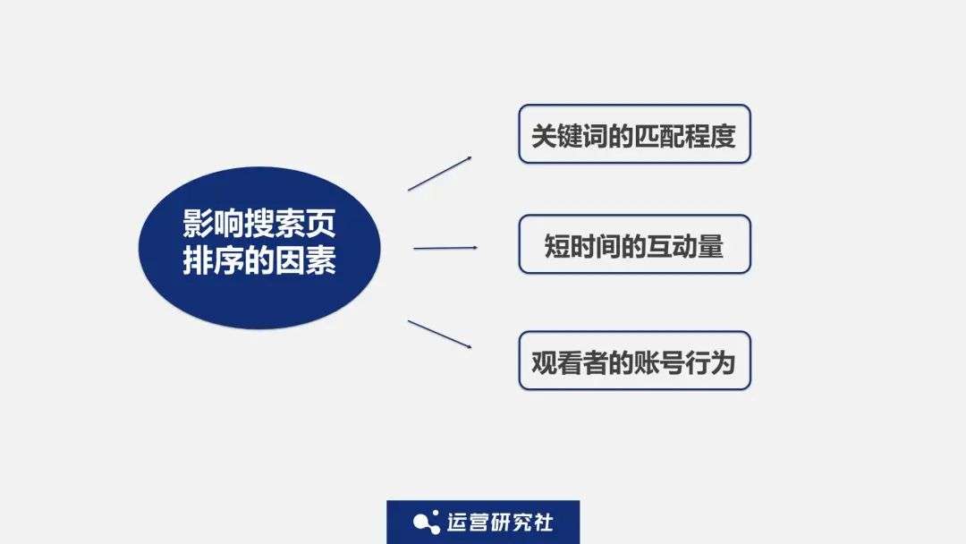 @勺子 告诉运营社,在搜索页面,影响排序结果的因素主要有三点: 关键词的匹配程度、短时间的互动量 以及 观看者的账号行为 。