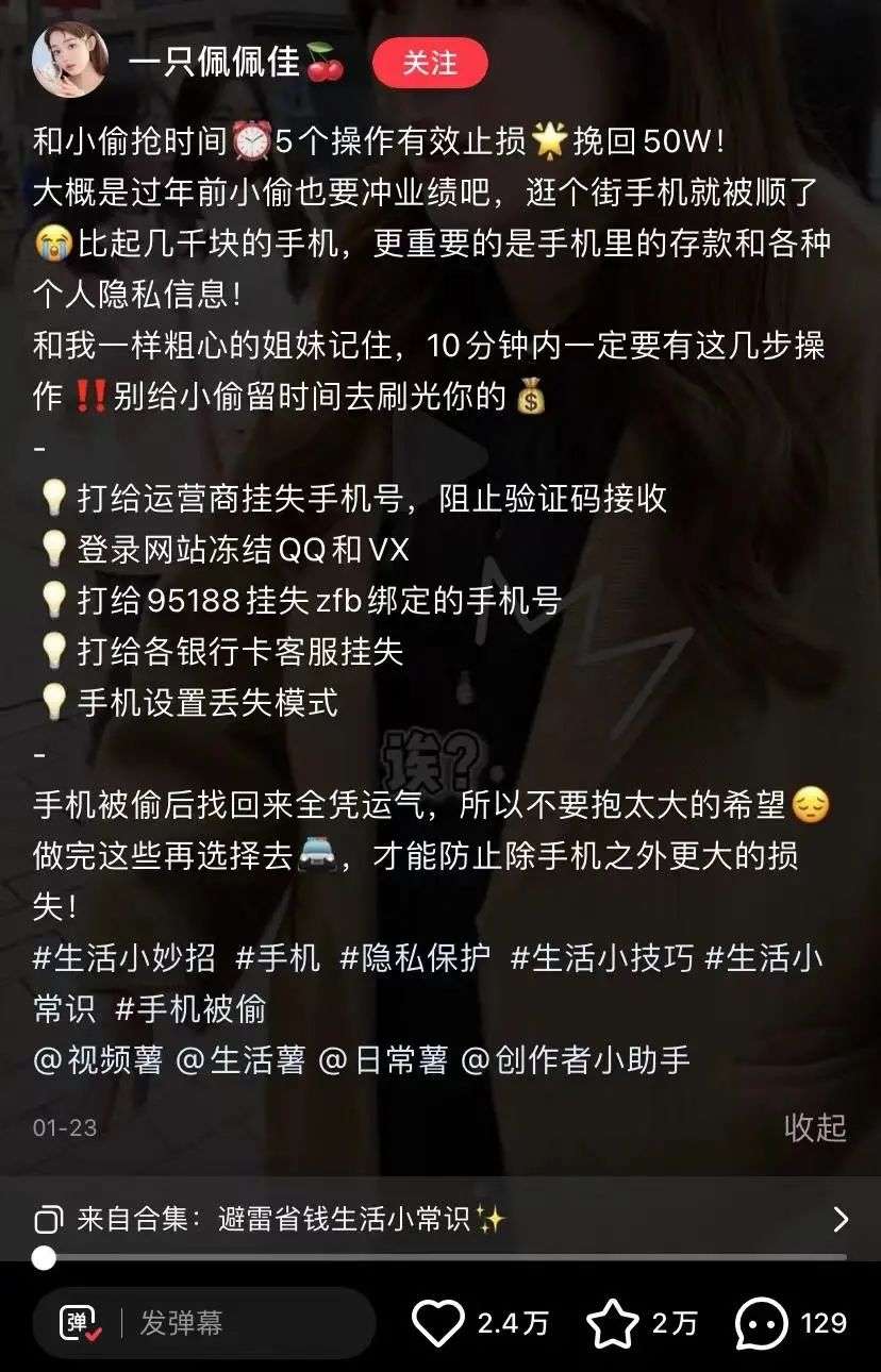 比如,这篇点赞、收藏数量高达 2w+ 的笔记,就是围绕生活中一些人常会遇到的问题“手机丢失后该怎么办”展开,提供了干货知识。