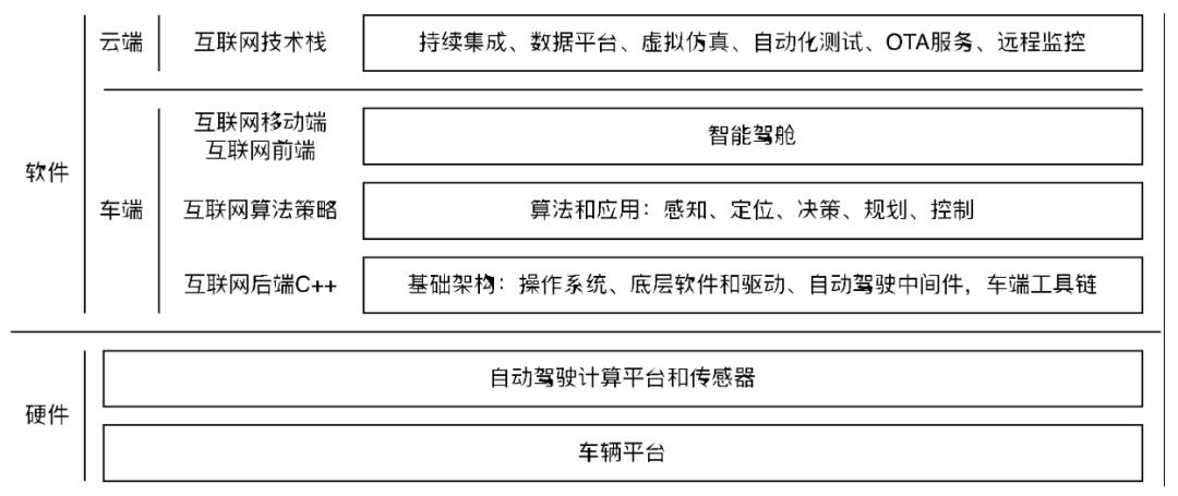 按照自底向上的顺序,首先将自动驾驶汽车广泛地分为硬件方向和软件方向。