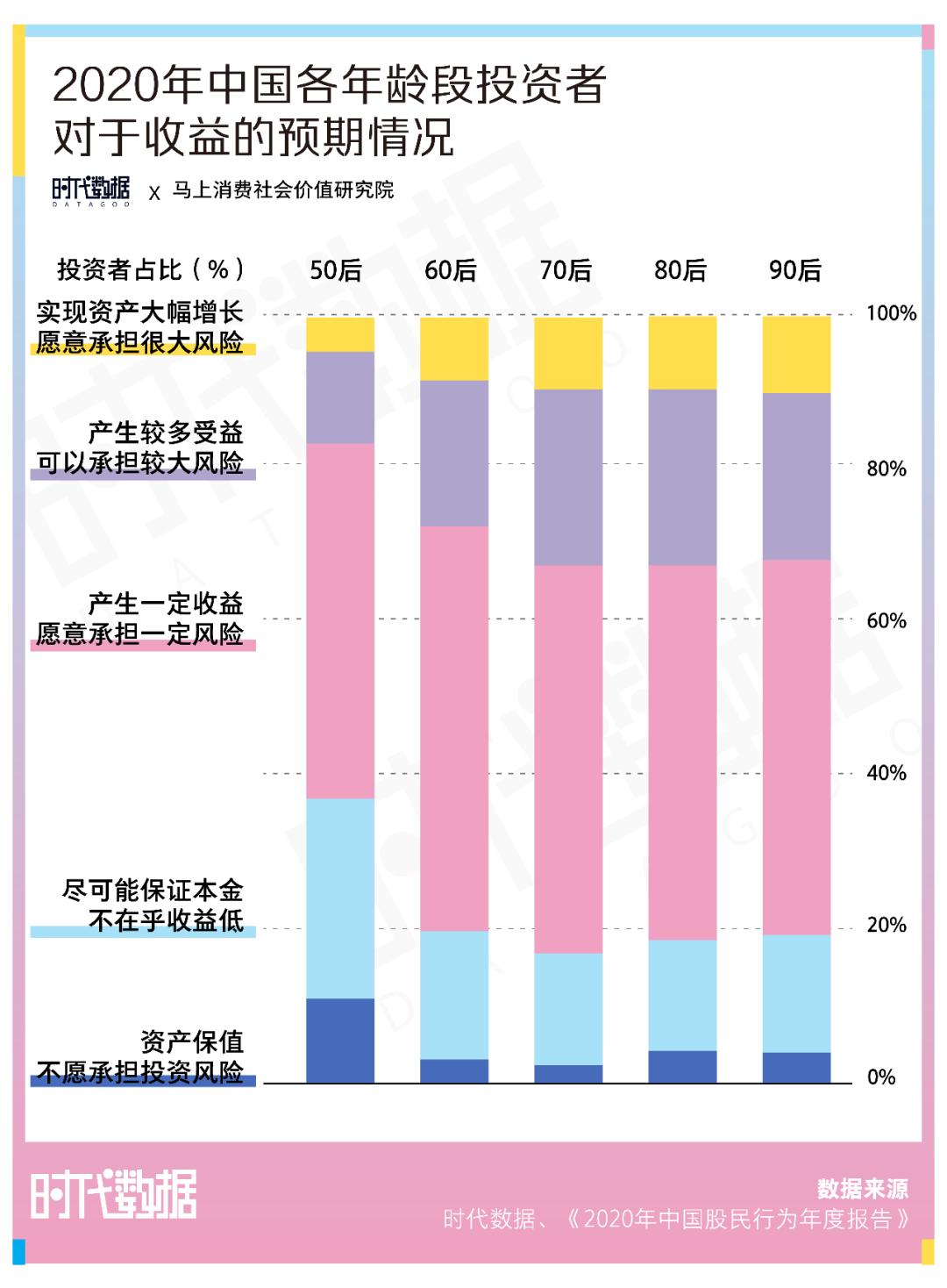 而《中国股民行为报告》则指出,90后对于投资风险的容忍度较其他年龄层都要高。报告提醒,有9.9%的90后追求资产大幅增长并愿意承担较大风险,在各个年龄层中占比最高。