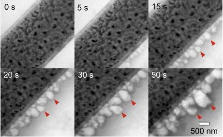 三角标记为正在生长的锂枝晶,锂枝晶是造成锂电池内部短路的常见原因