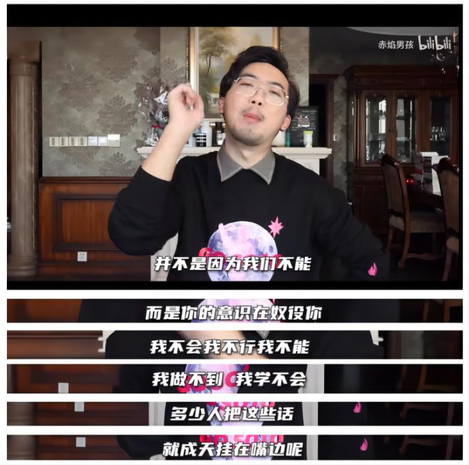 B站百万粉丝UP主赤焰男孩在视频《90%的人都在自我欺骗,甘当loser》中提到,许多人把“我不会”、“我不行”、“我不能”、“我做不到”、“我学不会”成天挂在嘴边,是因为“惨狗效应”。