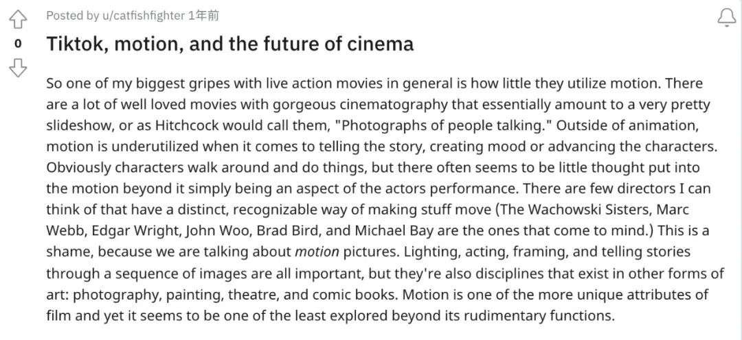 不过,这位用户却不认为短视频会为电影带来新的可能性,顶多能启发一些拍MV的灵感,毕竟“抽象”的运动本身并没有什么意义。