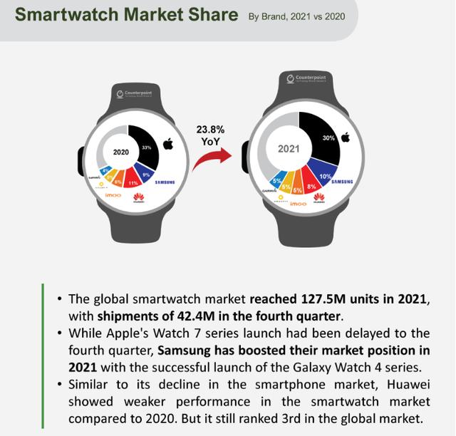 根据Counterpoint最近发布的资料显示,2021年全球智能手表出货量为1.275亿块,同比增长23.8%,苹果依然排名第一,市场份额达到了30%,随后的是三星、华为、IMOO、Amazfit和Garmin。
