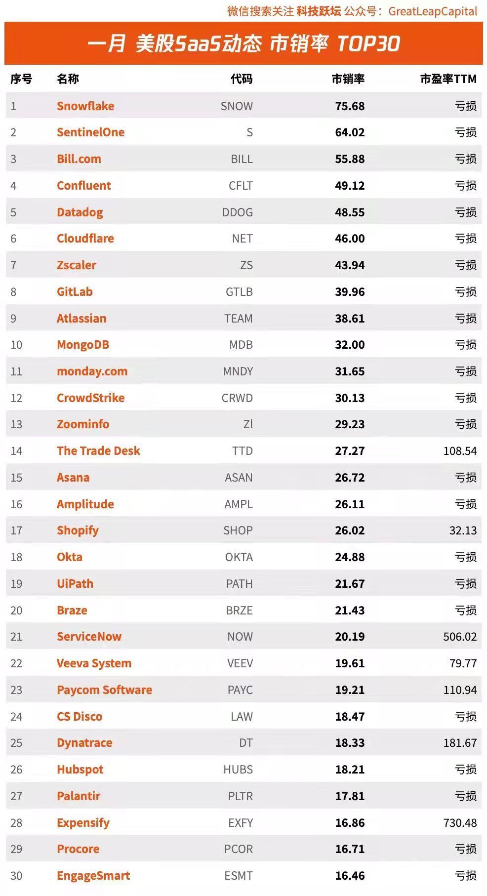 图二:2022年1月美股PS前30名,来源:科技跃坛