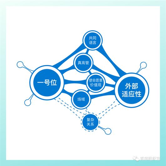这个模型里面有七个要素:一号位、外部适应性、真高管、使命愿景价值观、场域、共同语言、复杂关系。