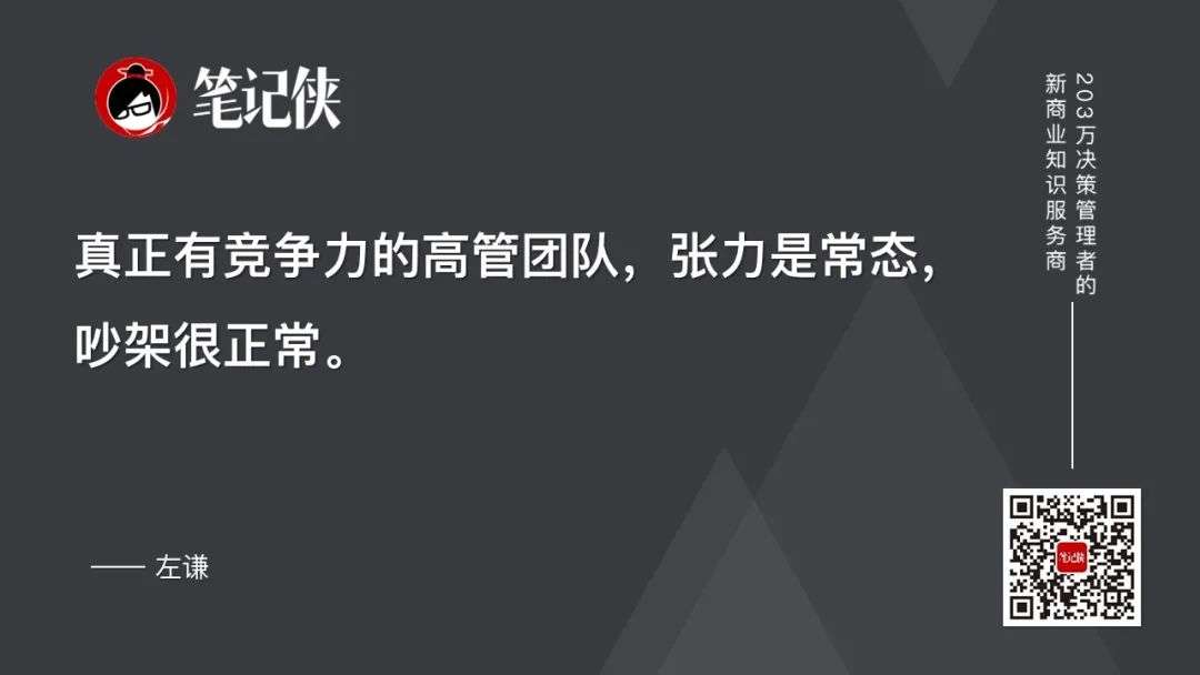 另外,一团和气的高管团队,就离落后和出局不远了,那种表面的和谐是不能带来竞争力的。真正有竞争力的高管团队,张力是常态,吵架很正常;当然我再强调一点,我们说的吵架不是人身攻击,更多的是争论,是深度讨论。最终基于外部适应性的考虑,大家彼此让步,达成共识。