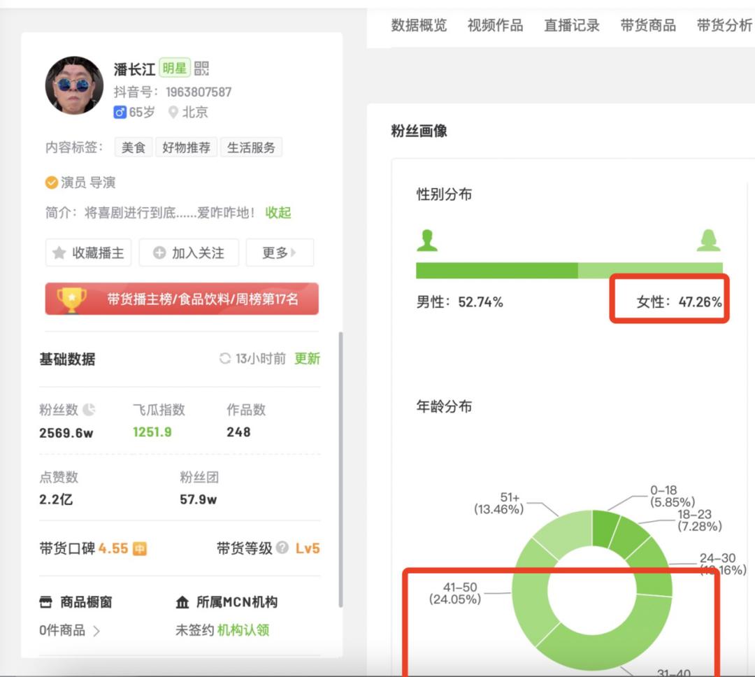 众所周知,白酒的消费人群主要是男性。但剁主观察到,在潘长江的直播间,粉丝画像女性比例达到47.26%,不少粉丝可能并没有对白酒的基本认知。