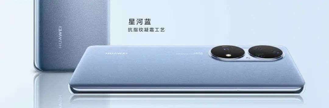 本次发布会华为 P50 系列也得到了升级,首先是带有未来感的星河蓝配色,首次采用了抗指纹凝霜玻璃工艺。
